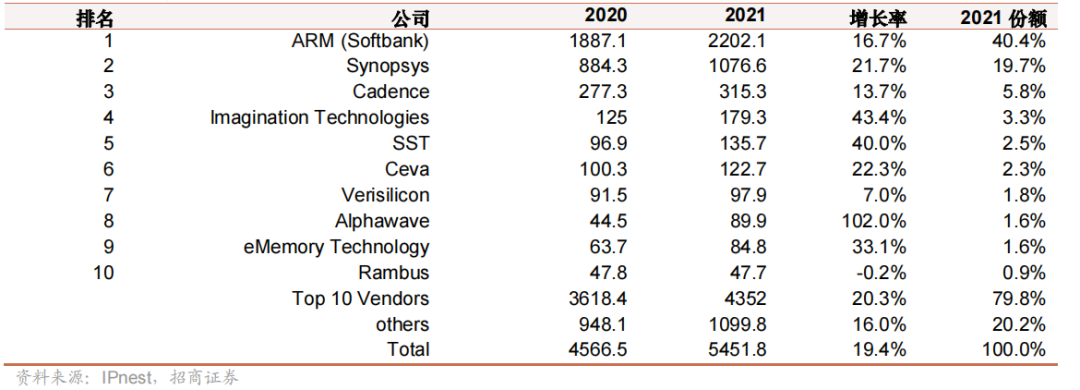 EDA 龙头公司 Synopsys 与 Cadence 均在 IP 领域有深度布局,2021年市占率分别在第二与第三的位置,而另一EDA 龙头 Simense EDA 前身为 Mentor graphics,在其创立早期阶段也曾涉足 IP领域。国内 EDA 企业如华大九天、芯愿景等在 IP 领域也具备一些产品线。
