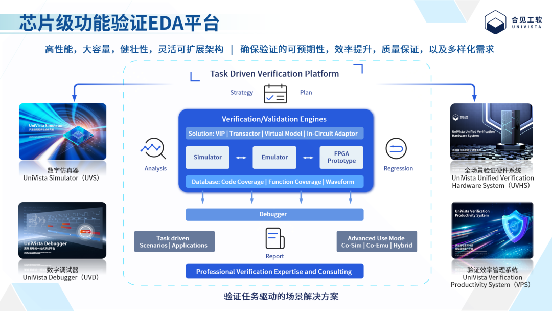 除在硬件验证工具层面实现整合之外,在软件仿真验证平台层面合见工软也在持续打磨。曹梦侠表示,合见工软的数字功能仿真器UniVista Simulator(UVS)在不断迭代,功能正确性及完备性已优先达到了Function Signoff级别;数字仿真调试器UniVista Debugger(UVD)着力提高验证调试效率,加速验证收敛,并可支持所有的验证工具;验证回归管理平台UniVista Verification Productivity System(VPS),持续致力于提升RTL回归效率。