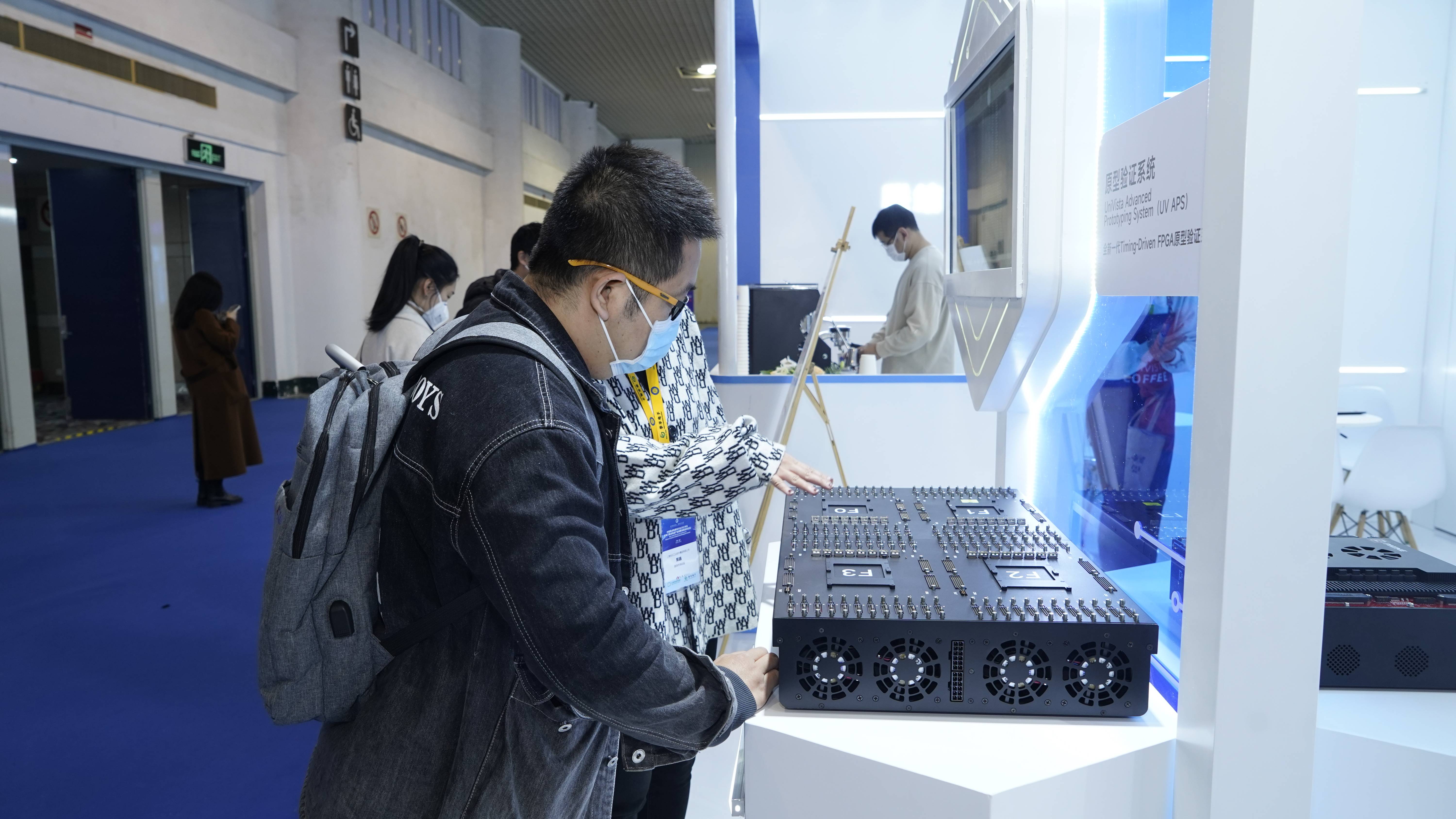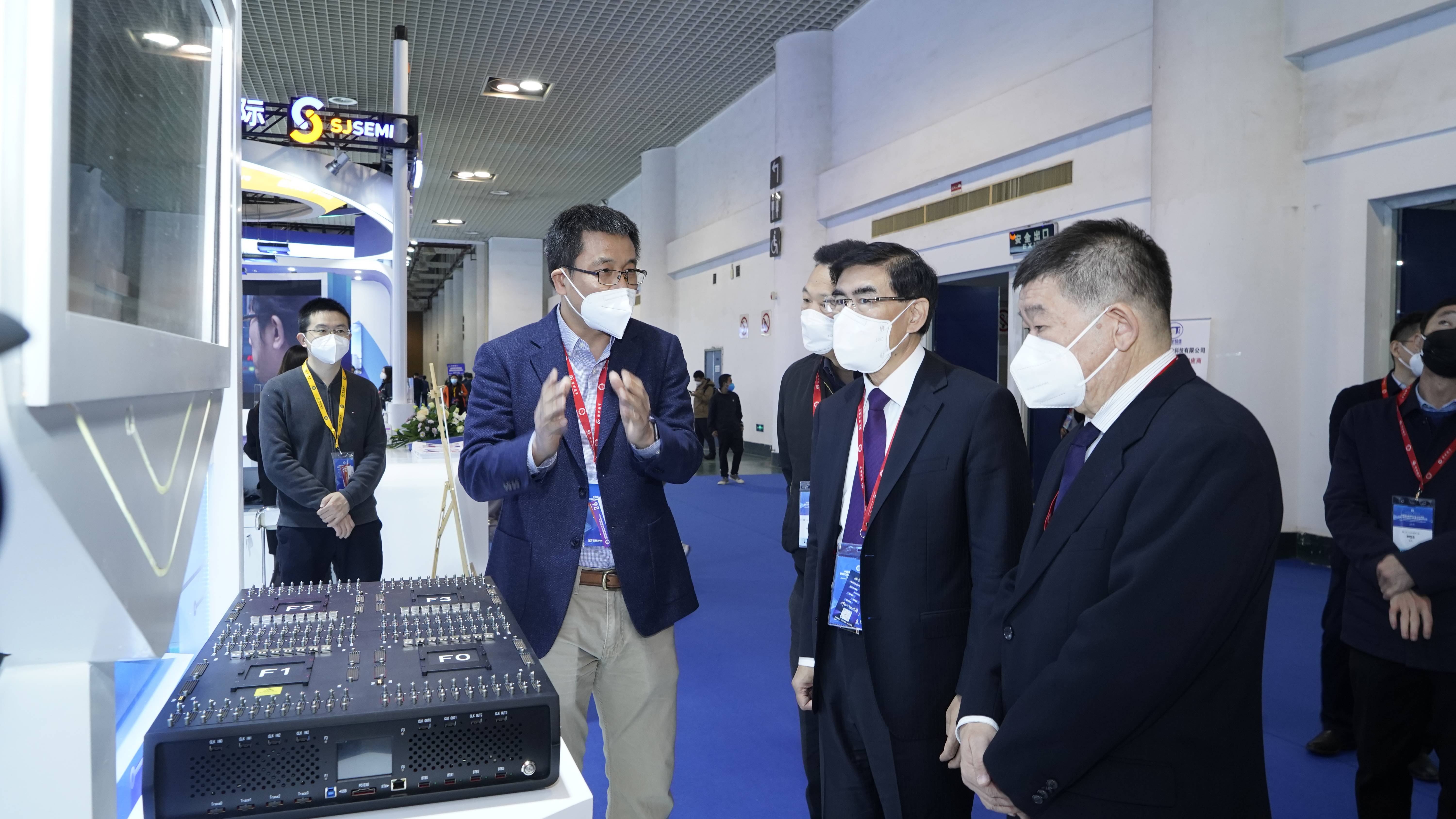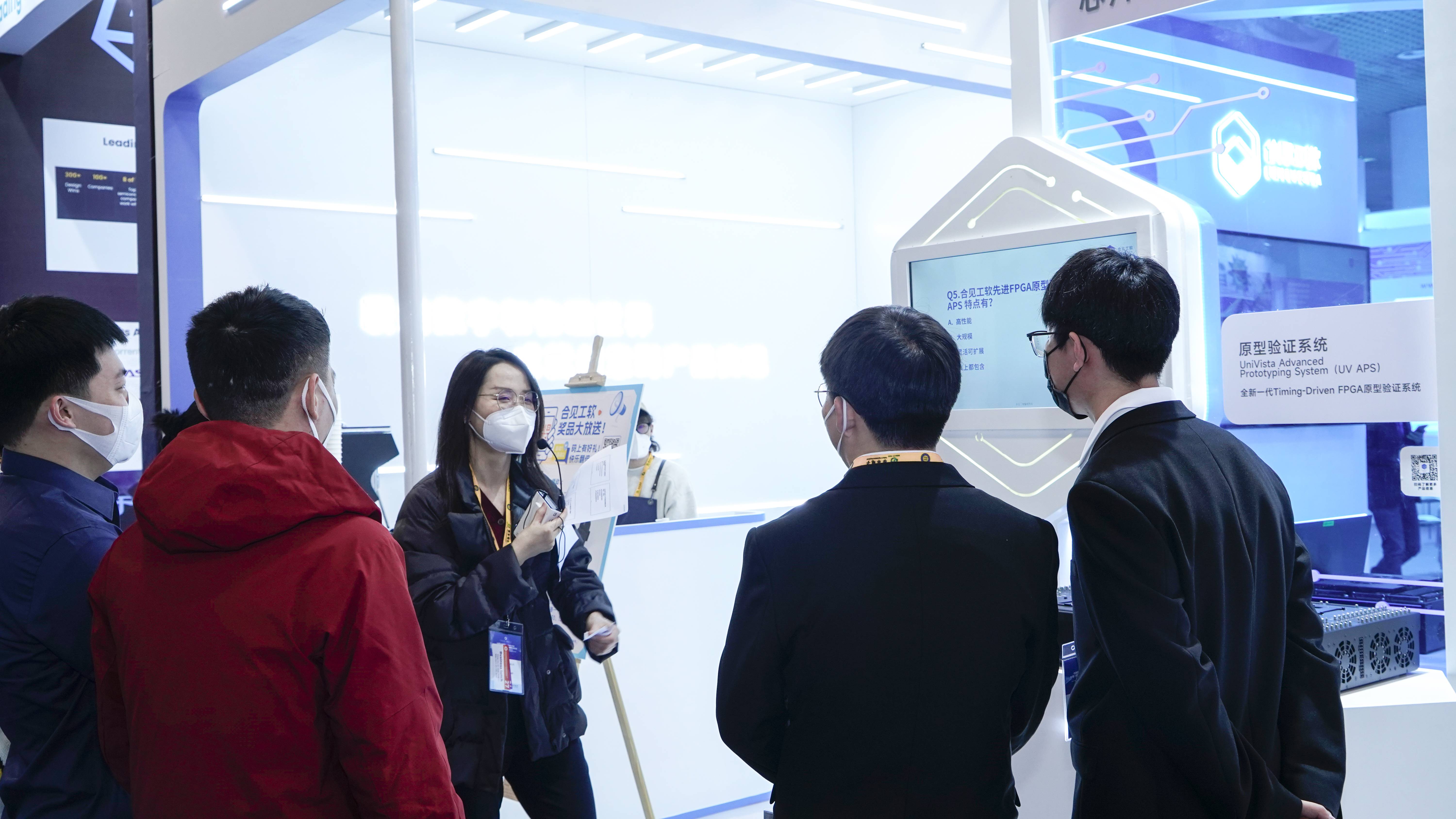 厦门市科学技术局局长孔曙光和中国半导体行业协会设计分会理事长魏少军教授莅临合见工软展位,合见工软公司产品工程副总裁孙晓阳为领导介绍了合见工软并展示了原型验证等相关产品。