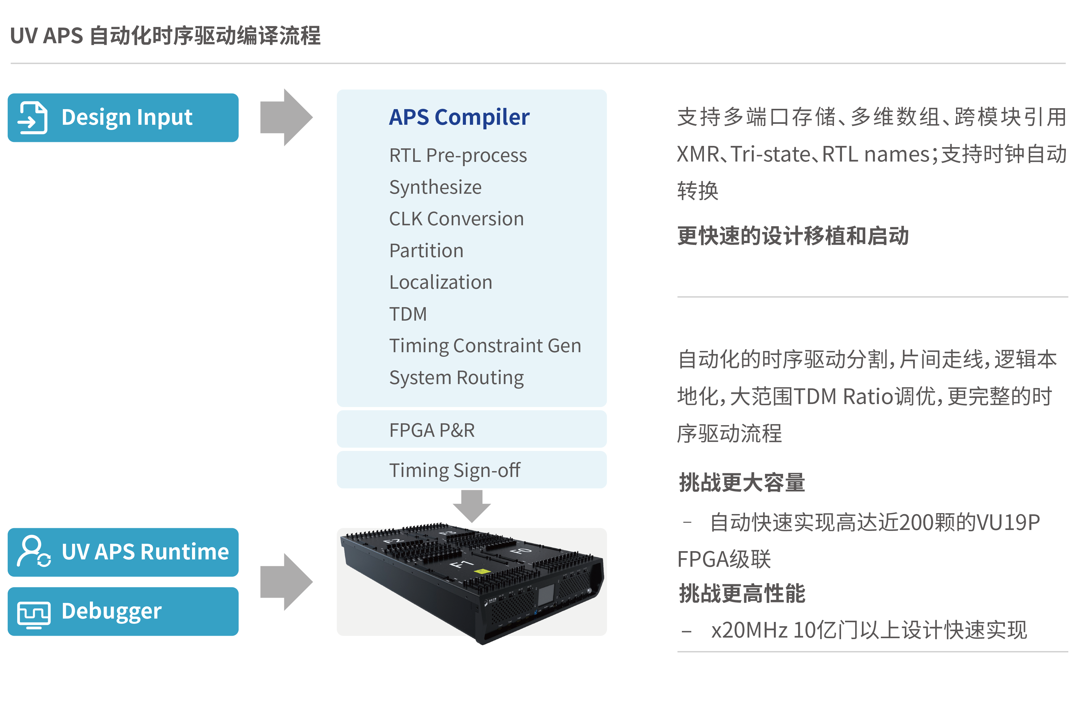 上海合见工业软件集团有限公司(简称“合见工软”)推出灵活、可扩展的先进FPGA原型验证系统UniVista Advanced Prototyping System(简称“UV APS”)。UV APS适用于大规模ASIC原型验证及SoC的开发,单套设备使用了4片Xilinx VU19P FPGA,可灵活堆叠。已实际商用部署的最大单系统达到160颗VU19P级联,超过60亿逻辑门,并支持更大规模的扩容能力。集成智能化、自动化的全流程编译软件 APS Compiler为芯片设计者提供了高效的验证方式,降低在验证阶段的时间成本;同时提供丰富的FMC接口子卡,以适配各种接口验证,提供充足的One-Bank互联通道,以支撑系统扩展;配合深度调试方案,缩短测试周期,加快芯片上市。